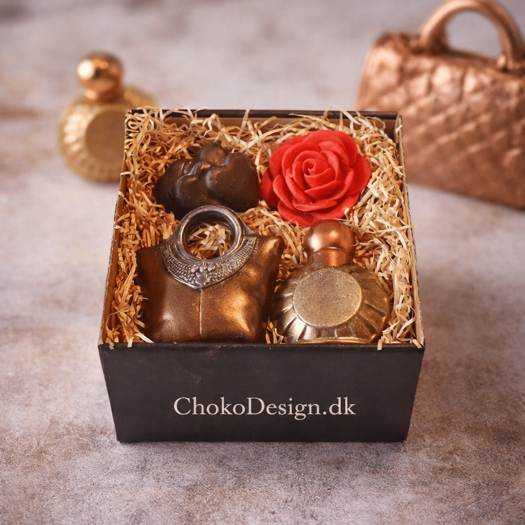 “Oplev en verden af elegance med vores eksklusive parfume- 🌸 og håndtaskekit 👜 i en fortryllende gaveæske. Den realistiske chokolade 🍫, delikate roser 🌹 og hjerte 💖 gør dette til den perfekte gave til hende, der fortjener ekstra forkælelse. Skab uforglemmelige øjeblikke med dette luksuriøse sæt.”