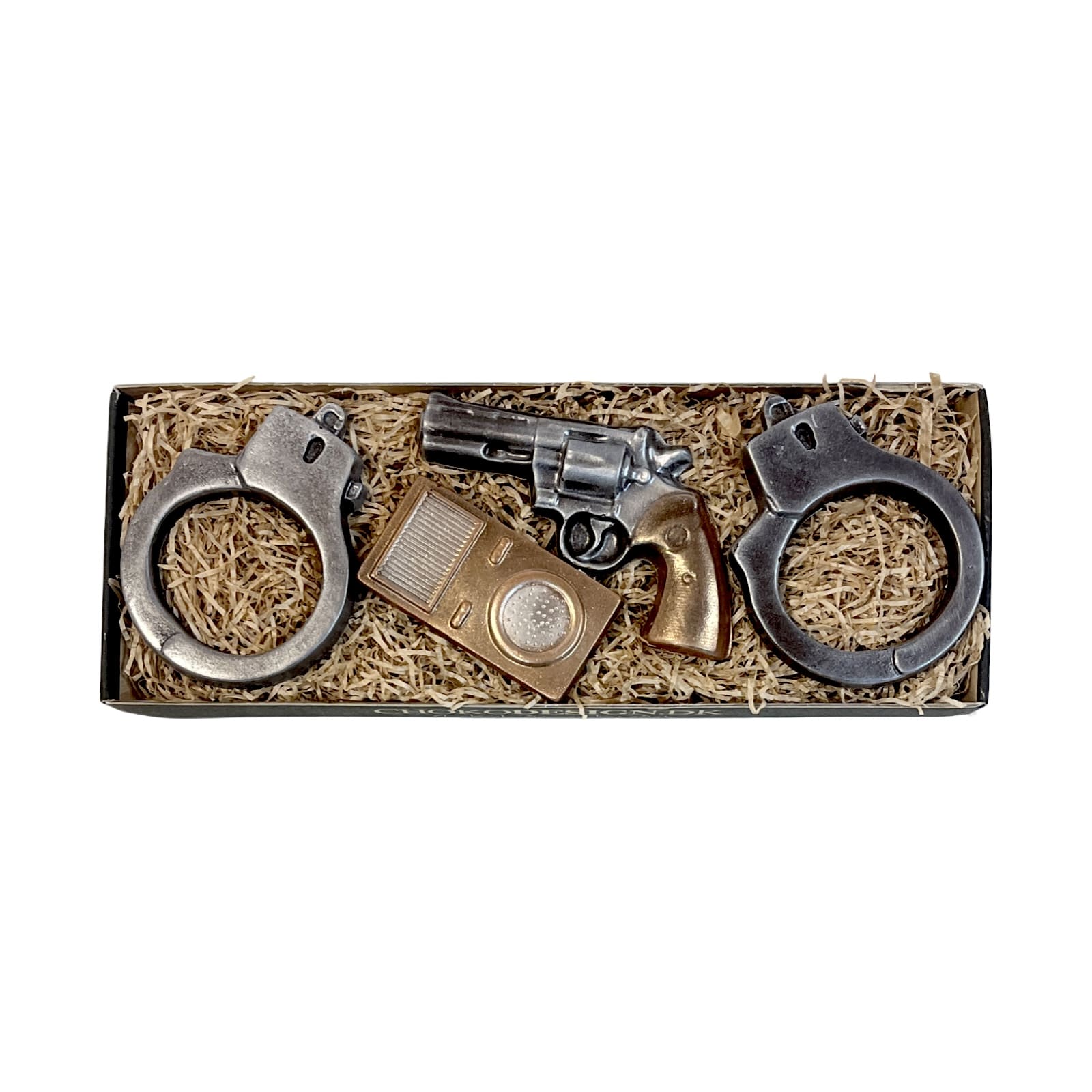 Vores chokolade er skabt med omhu og inkluderer realistiske håndjern og andre detaljer. 🍫🔑