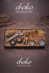 Her får du en håndlavet chokoladeæske, fyldt med de sejeste detaljer – værktøj, dele og traktor-lækkerier, der ligner noget direkte fra værkstedet… men smager MEGET bedre 😄👌